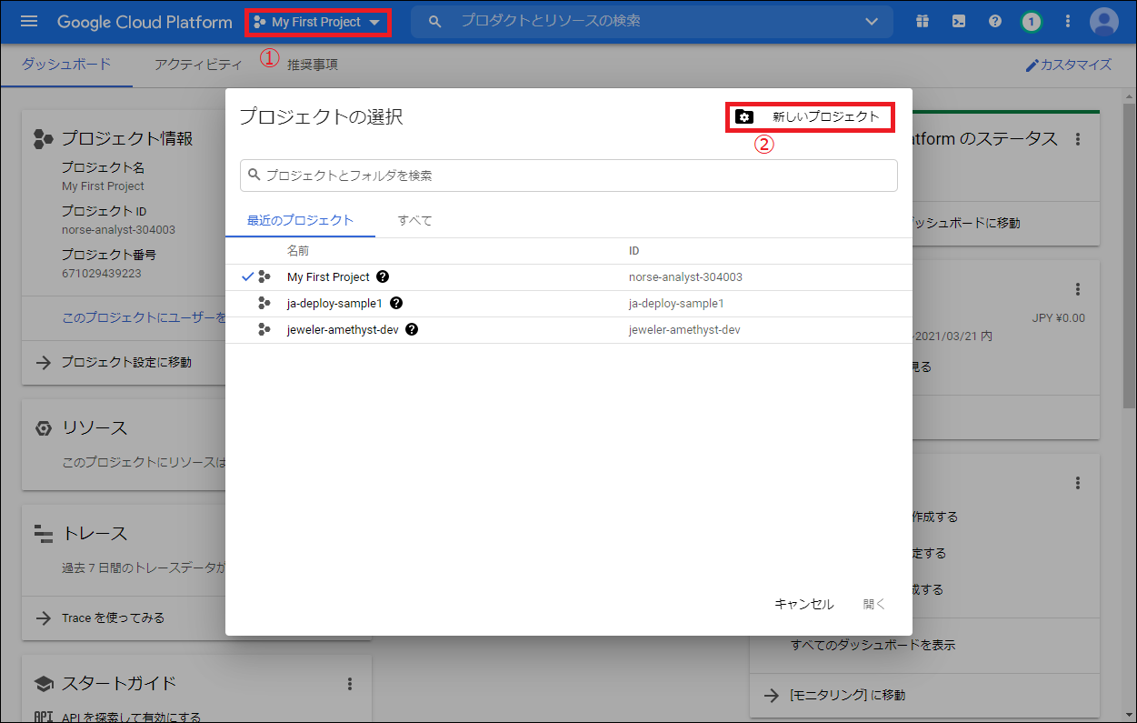 - GCPにアカウント登録後、ブラウザ上で管理画面のプロジェクト選択プルダウン①をクリックし、新しいプロジェクト②をクリックしてください。