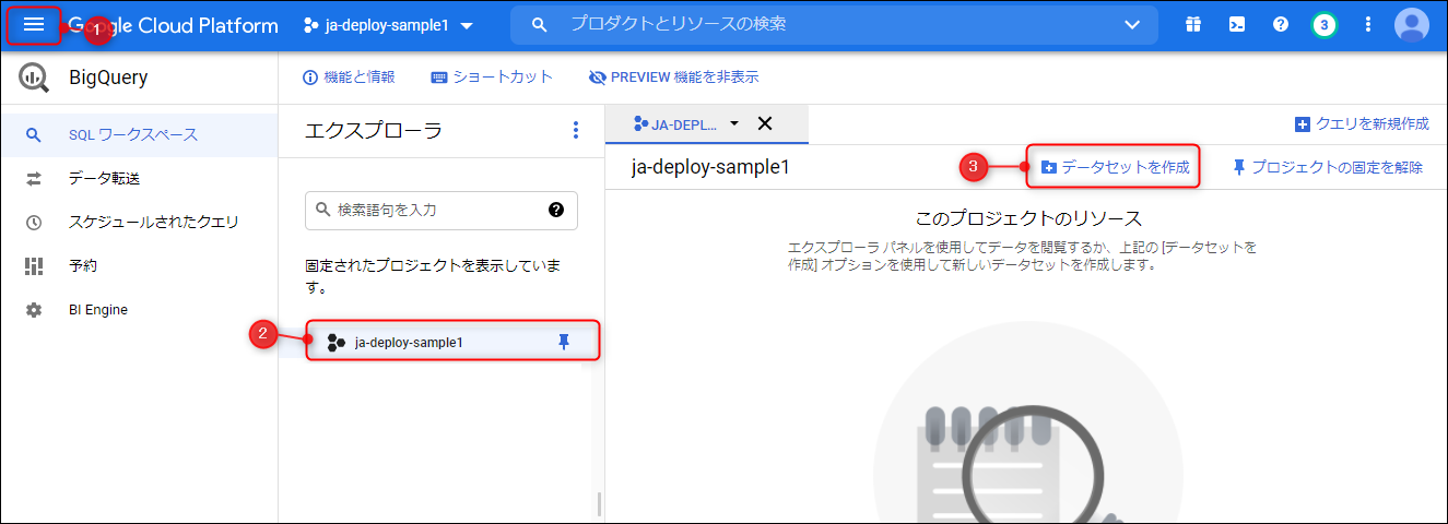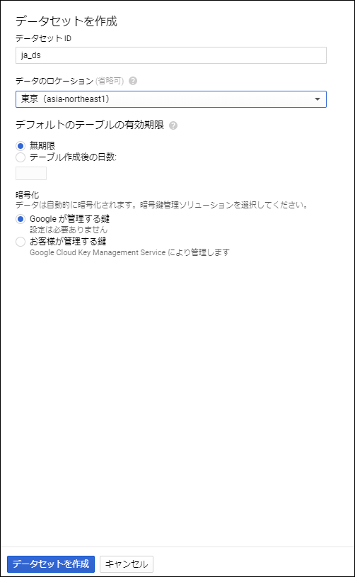 データセット作成画面で下記内容で入力または選択し、データセット作成